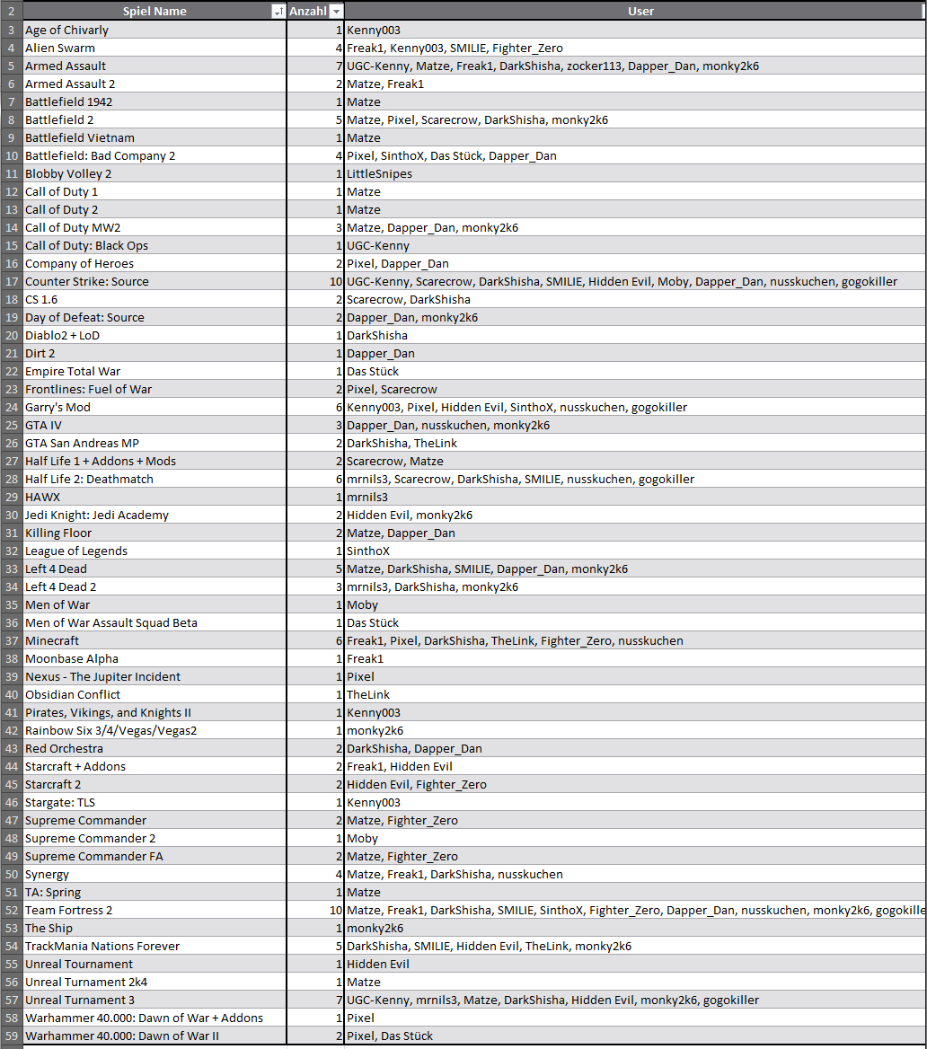 Ich werde den Thread morgen durch schauen und alle Games mit Useranzahl und Spieler auflisten und aktuell halten.