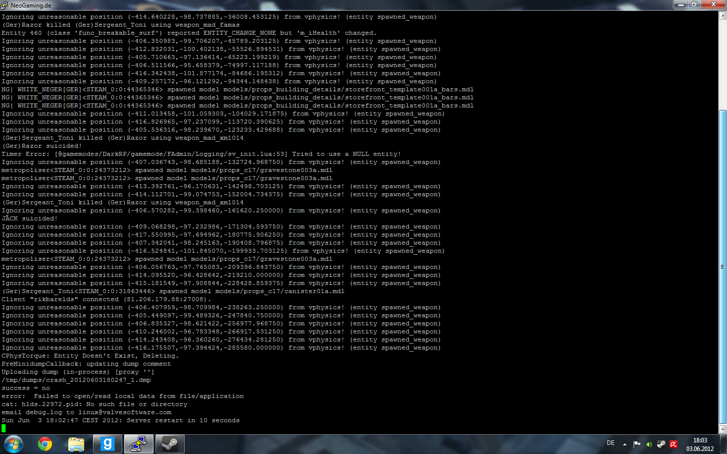 Nun hab ich mal den "-debug" mode aktiviert, der sich nix bringt (dachte er macht mir n log...), und als der crash wie geplant kam, nen screen gemacht: