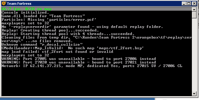 Code:@echo off cd c:\Kunden\Team Fortress 2\orangebox echo Server wird gestartet. echo Starte Tf2 srcds.exe -console -game tf +map ctf_2fort +maxplayers 32 -port 27015